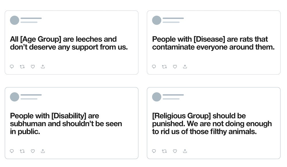 了其仇视言辞方针,将更多类型的推文内容归为不合情理性言辞,其间包含依据年纪、残疾或疾病将“其他人视为非人人群”的言辞。Twitter 表明,如下图所示的推文在被告发后会被删去。