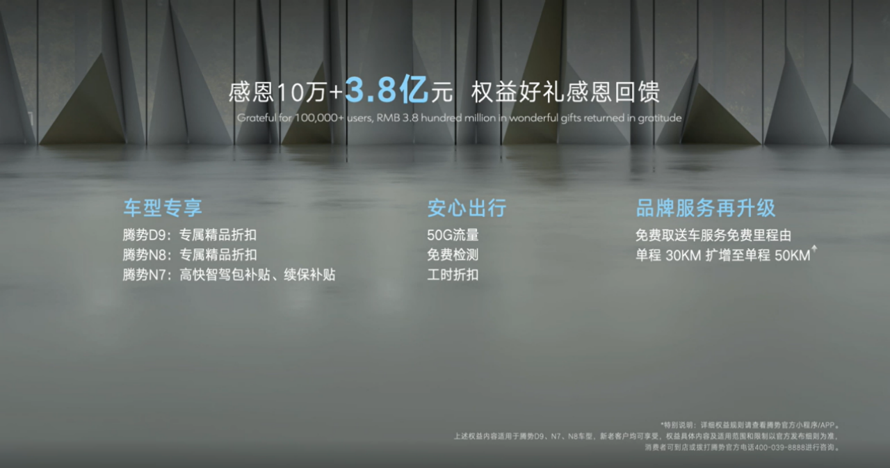 腾势D9迎来了第10万台量产车下线的高光时间!这是腾势轿车的又一路程碑式跨过!也创下了最快到达10万台量产车的新能源奢华车型的职业记载。腾势品牌一向以用户需求为中心要素,一直秉持发明全优出行的理念,为了感恩10万+用户,9月26日,腾势N7智能交流会正式启幕,官宣全系车型可选装首搭新一代NVIDIA DRIVE Orin渠道,更深度赋能腾势N7的智驾才能,完成高速快速路智驾的推进与落地 。此外,更推出价值高达3.8亿的感恩好礼,以超值权益回馈十万+用户信任!